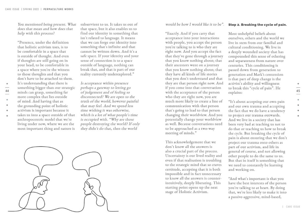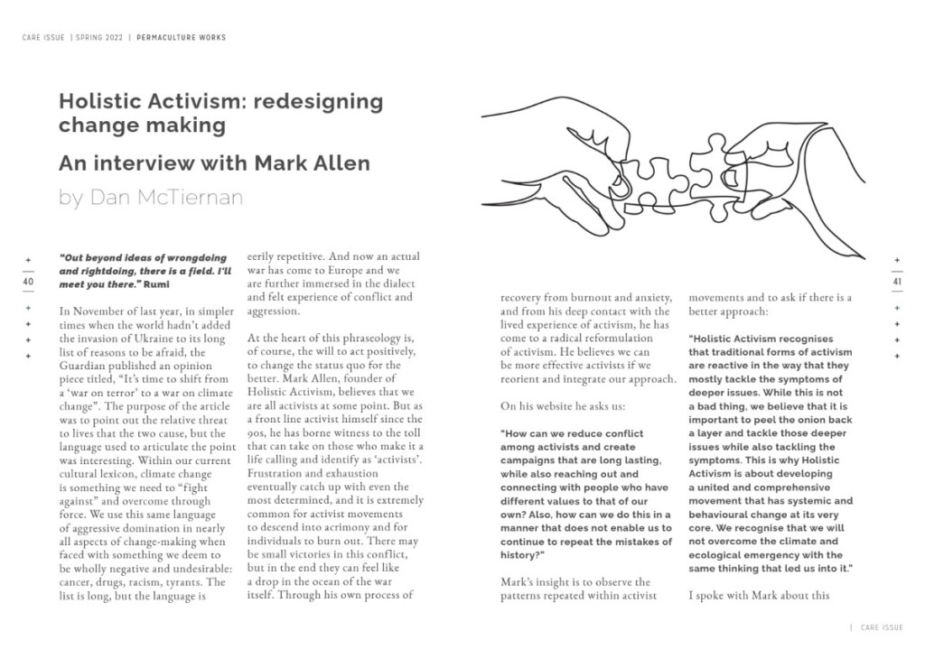 Mark was interviewed by Dan McTiernan for the Spring 2022 edition of the Permaculture Works journal. To see the article more clearly, right click on each section and ‘open image in new tab’.
